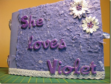 La mia amica adora il viola…in maniera quasi ossessiva! Quest’anno è moderno, quindi non sembra così strano, però lei è sempre stata viola dipendente! Quindi ho sfruttato tutte le foto che ho di lei per creare questo album, dove in ogni pagina metto la foto e la situazione in cui lei è vestita di viola! Al suo compleanno, ai matrimoni, in vacanza, quando si diverte..ecco insomma.. Mi dispiace ma le pagine interne non le posso mettere..ma vi posso solo dire che le è piaciuto davvero tanto…