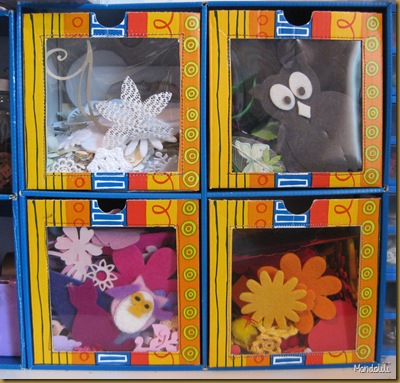 Ora ho deciso che non divido più feltro da carta, grande e piccolo, cuori e fiori, farfalle e gufi. Tutto dentro qua, diviso per colore.